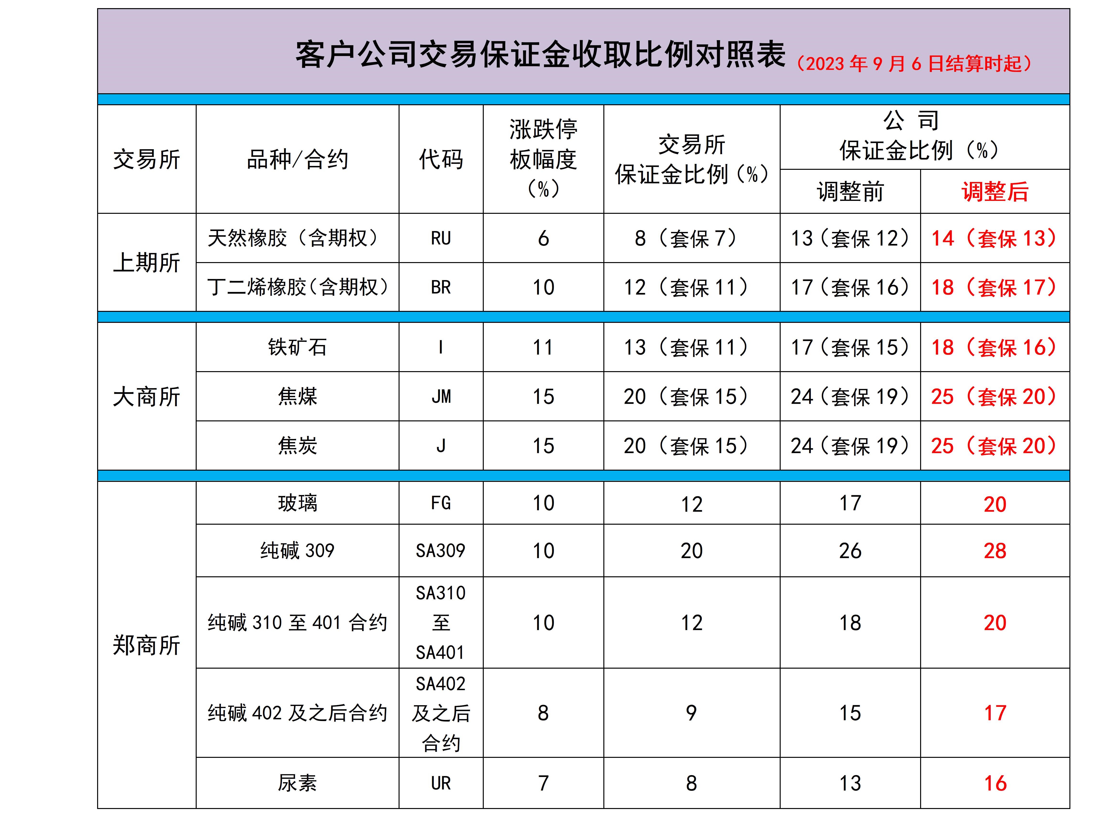 根据目前国内外期货市场形势,我司在结合业务需求、分析品种波动率和公司整体持仓的情况下,经研究决定,自2023年9月6日(周三)结算时起,对部分期货品种客户公司保证金比例作如下调整: