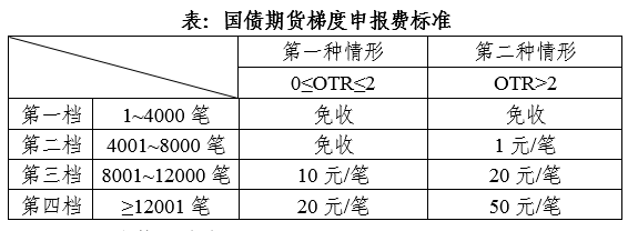 1.交易所对单日在国债期货合约上信息量和OTR达到一定标准的非期货公司会员、客户收取梯度申报费。信息量是指买入、卖出以及撤销委托笔数的总和,报单和撤单各计为1笔。因即时全部成交或撤销限价指令、即时成交剩余撤销限价指令、市价指令产生的报单和撤单计入信息量统计。