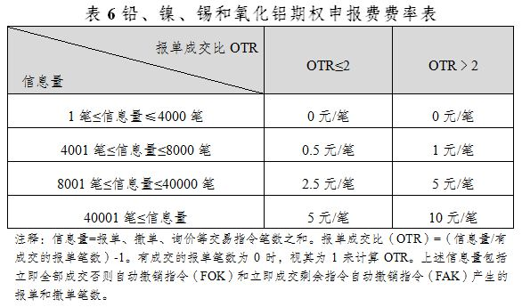 铅、镍、锡和氧化铝期权对客户信息量收取申报费,各品种收取标准一致,如下表所示。