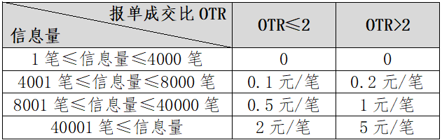 注释:信息量=报单、撤单、询价等交易指令笔数之和。报单成交比(OTR)=(信息量/有成交的报单笔数)- 1。有成交的报单笔数为0时,视其为1来计算OTR。上述信息量包括立即全部成交否则自动撤销指令(FOK)和立即成交剩余指令自动撤销指令(FAK)产生的报单和撤单笔数。