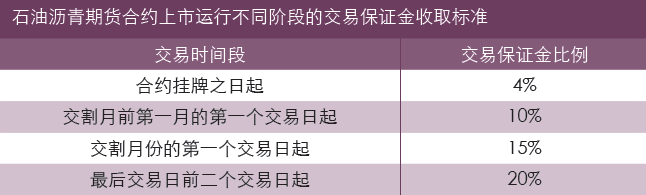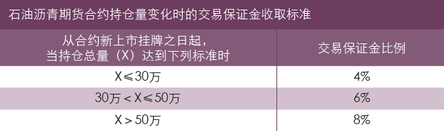 交易所根据某一期货合约持仓的不同数量和上市运行的不同阶段制定不同的交易保证金收取标准。石油沥青期货合约上市运行不同阶段的交易保证金收取标准: