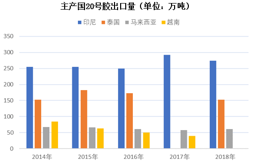 泰国和印尼是全球最大的两个天然橡胶出口国;越南近几年天然橡胶产业发展迅速,其年出口量持续提升,目前已超过马来西亚成为第三大天然橡胶出口国。2018年,泰国、印尼、越南、马来西亚分别出口天然橡胶411.22万吨、295.42万吨、150.01万吨、112.32万吨,四国合计出口量占ANRPC总出口量的95.77%。