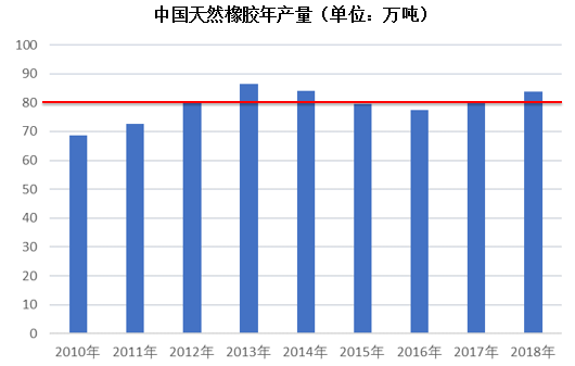 我国由于地理位置相对偏北,因此适宜种植橡胶树的区域较少,目前仅有云南省和海南省具备种植的环境条件,其中云南产区为全球天然橡胶最北端的产区。2018年,我国天然橡胶年产量为83.7万吨,占ANRPC总产量的6.88%。