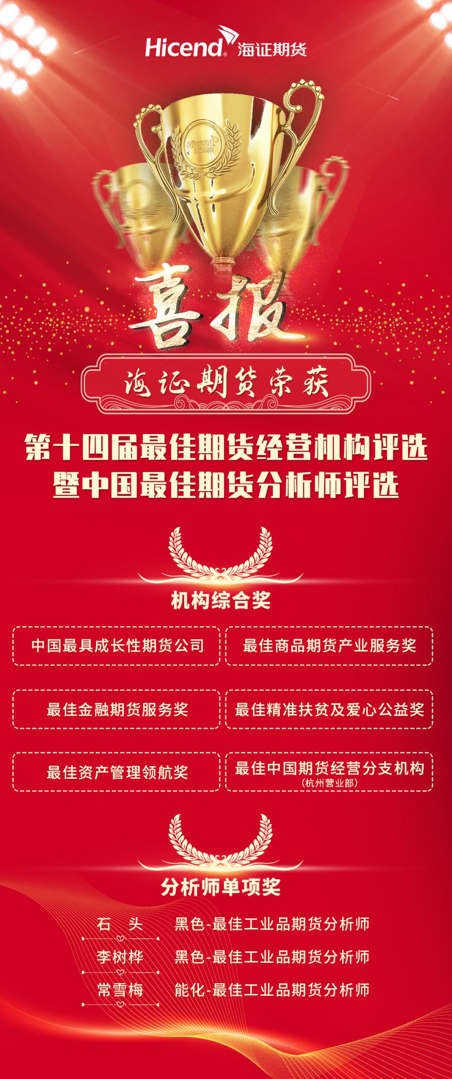 海证期货在此次评选中荣获了“中国最具成长性期货公司”、“最佳商品期货产业服务奖”“最佳金融期货服务奖”“最佳精准扶贫及爱心公益奖”“最佳资产管理领航奖”“最佳中国期货经营分支机构(杭州营业部)”六项殊荣,公司三名研究员摘得“最佳期货分析师”荣誉称号。
